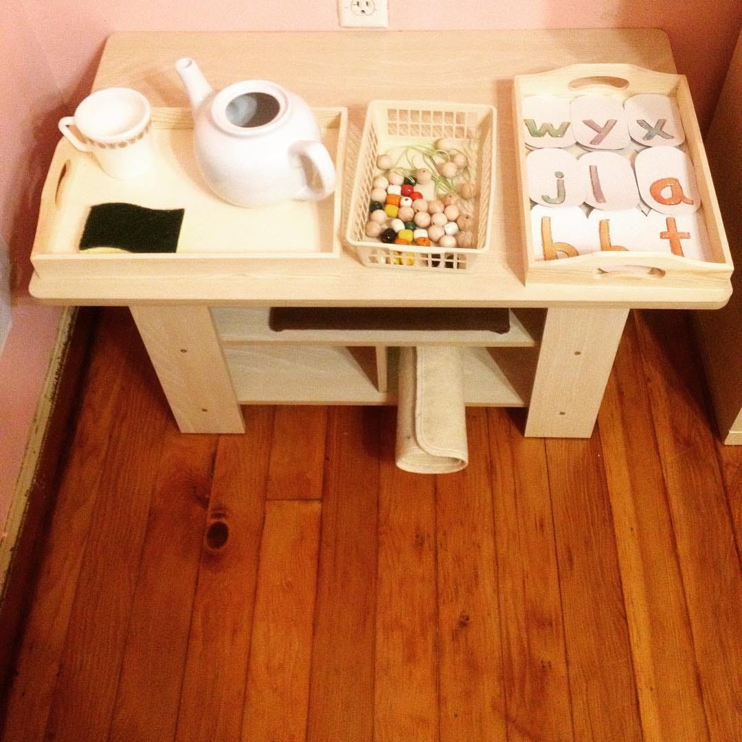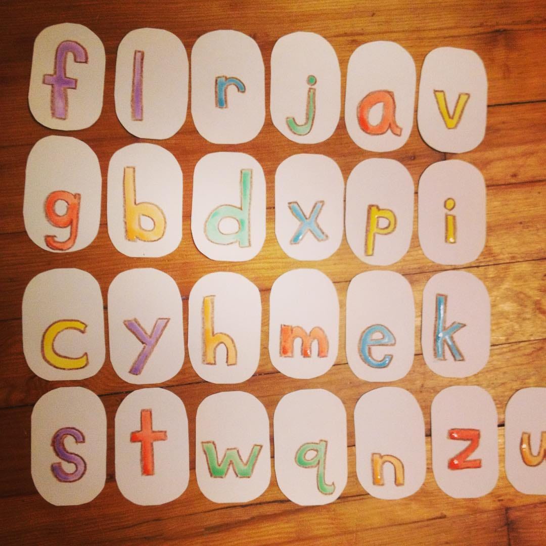So I bought some wooden trays from Target, and got some other supplies for dirt cheap from a local second hand store. I decided to create a bunch of “Montessori at home” materials, my thinking being that it would be great independent work for her, she would be learning through exploration, and it would avoid what I was afraid of, which was pushing academics. There were carefully made lowercase letter cards (watercolored and then, once dried, made three dimensional with a layer of hot glue), rice dyed different colors that could be scooped and mixed, lacing cards, a felt chain that could be taken apart and put back together by fastening and unfastening little buttons, beads to be put on strings, number cards, and more! I devised a plan for rotating out the options so they would remain somewhat fresh. And I lost many hours of sleep creating, sorting, and planning it all. My partner was impressed.